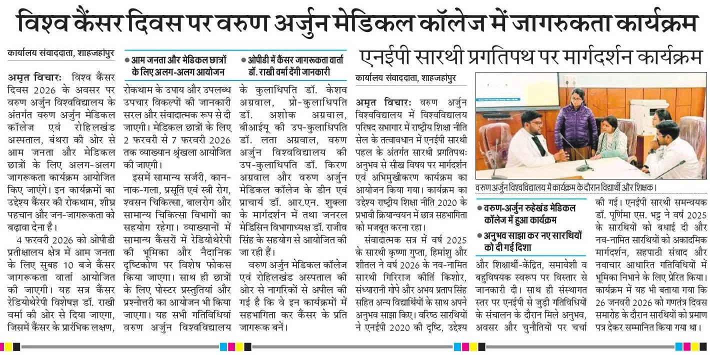 Varun Arjun Medical College & Rohilkhand Hospital, under Varun Arjun University, Shahjahanpur, observed World Cancer Day 2026 with a comprehensive public awareness initiative and an academic lecture series aimed at promoting cancer prevention, early detection, and public sensitization.